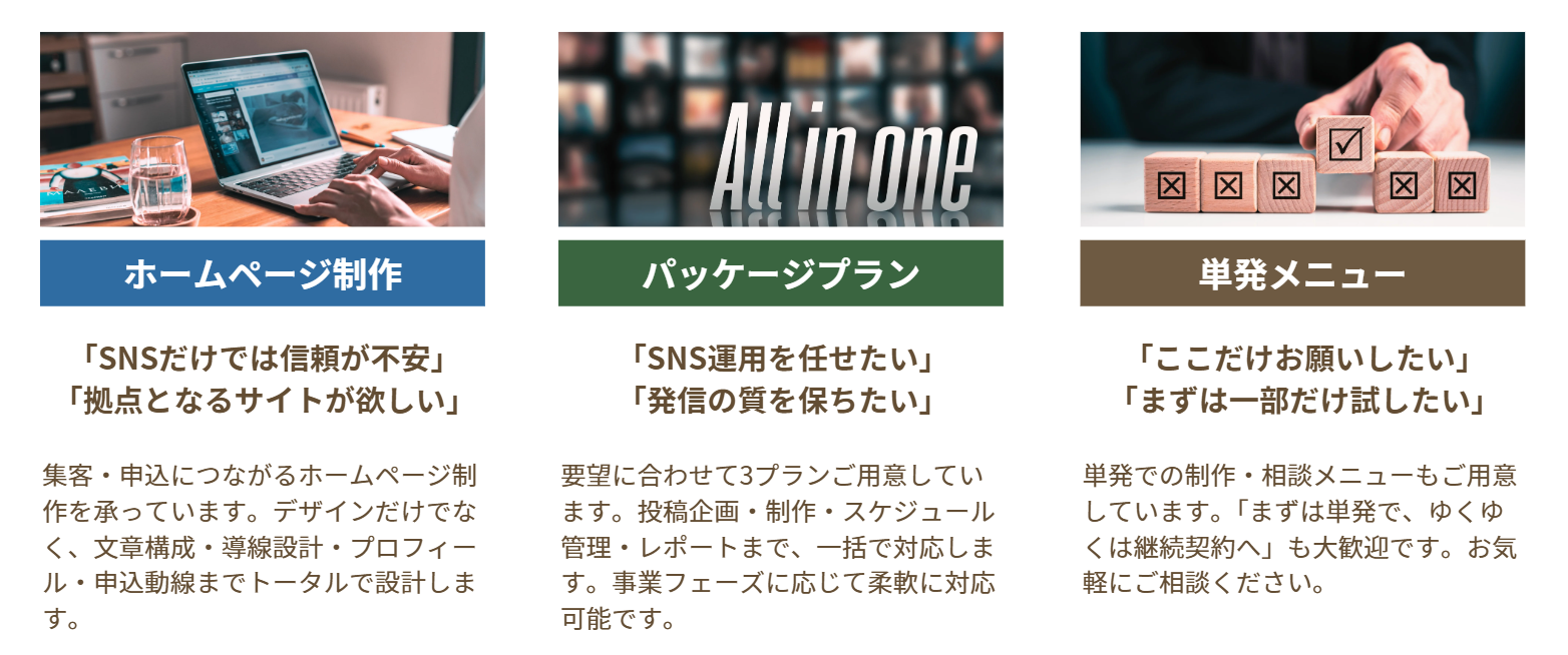 「SNS運用を任せたい」「発信の質を保ちたい」方向けのセットプランです。