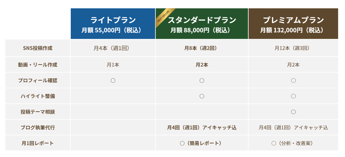 | SNS投稿(文章+簡易デザイン) | 1投稿:3,000円〜5,000円 月4本:13,000円〜18,000円 月8本:24,000円〜32,000円 |